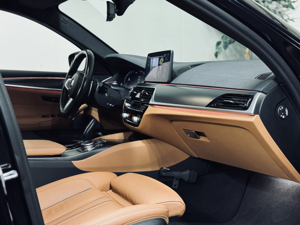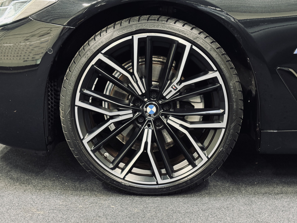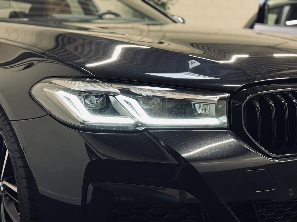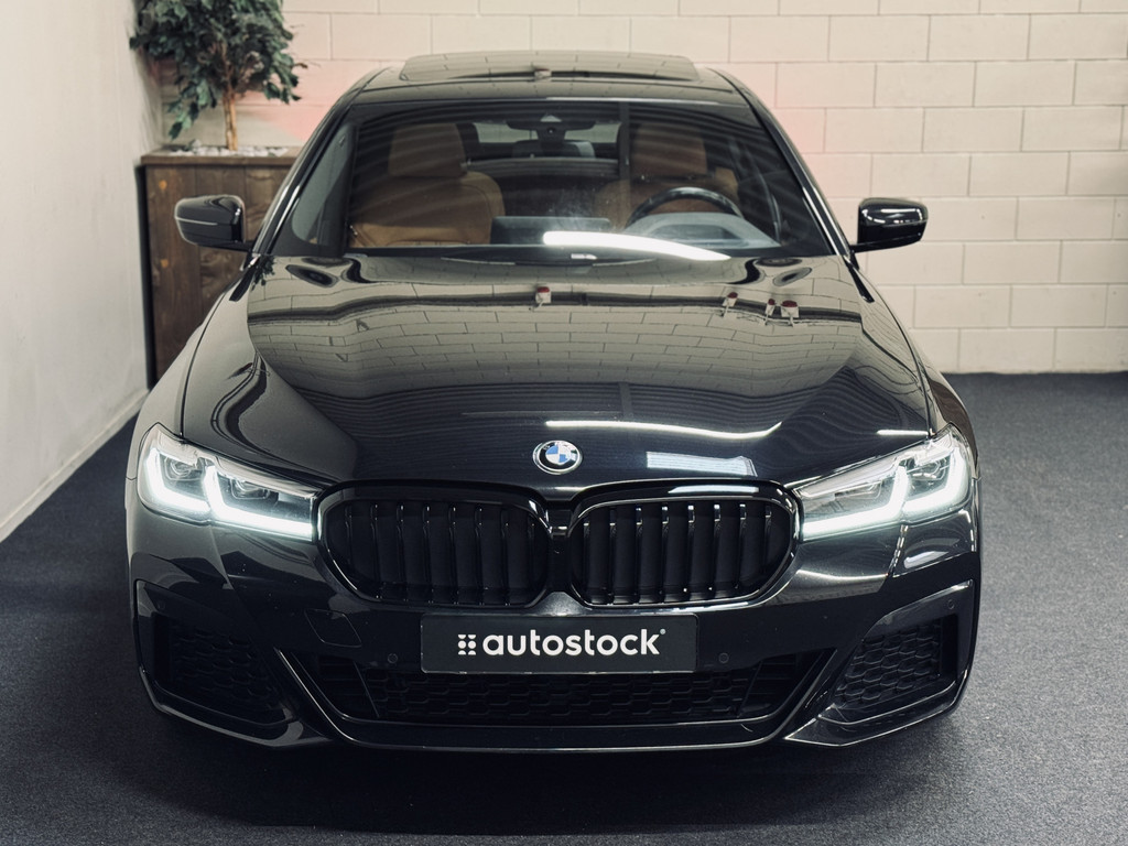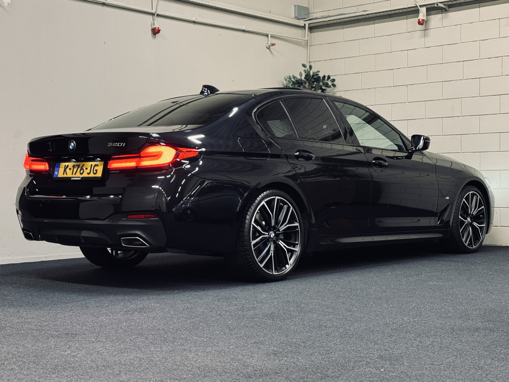 Zeer fraaie BMW 520i LCI in High Executive M-Sport Plus uitvoering. Origineel Nederlands geleverd, afkomstig van de eerste eigenaar en volledig dealer onderhouden. Uitgerust met o.a. 20" M-lichtmetalen velgen, glazen schuif/kanteldak, adaptieve LED koplampen, uitgebreide Shadowline exterieurafwerking, head-up display, draadloze telefoonlader, achteruitrijcamera, HiFi audio, elektrisch bedienbare achterklep, etc. Tegen meerprijs van € 950,- is een originele, zwarte 18" BMW winterset beschikbaar met zo goed als nieuwe GoodYear winterbanden.