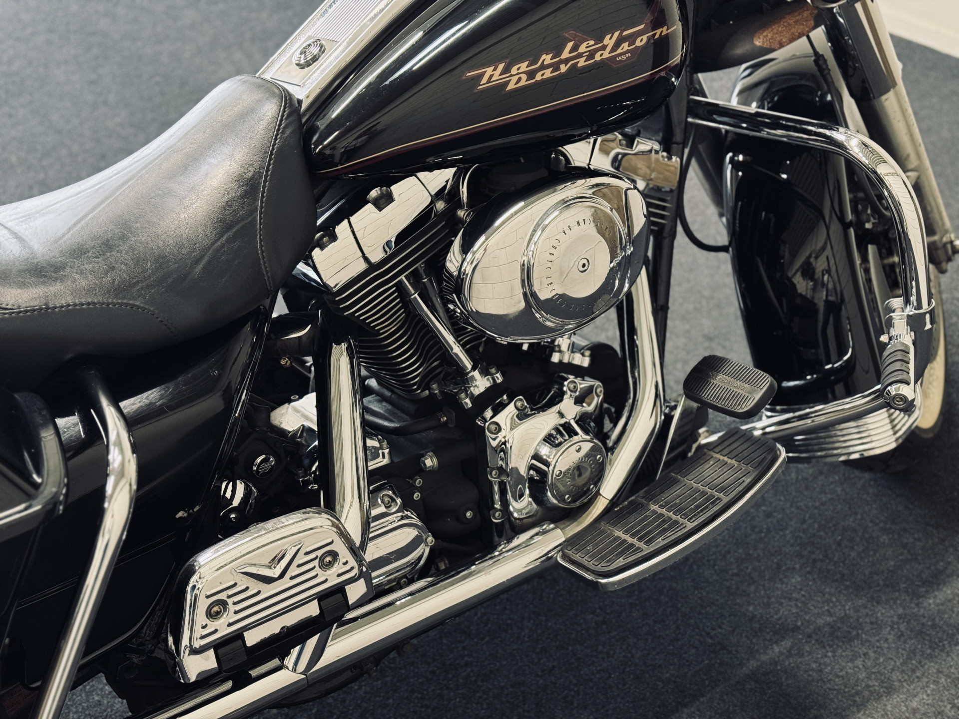 Hele fraaie Harley Davidson Road King met het gewilde motorblok en de échte HD-sound. Voorzien van schijfremmen, hardcase zijkoffers, toerenteller, etc. Deze motor is in 2012 uit Engeland gekomen en is reeds 10 jaar in bezit bij de huidige eigenaar. Ca. 500 km geleden nieuwe remblokken gekregen, achterband en oliewissel. Recent is de accu vervangen. Onderhouden bij een HD-specialist. Afneembaar windscherm is aanwezig.
